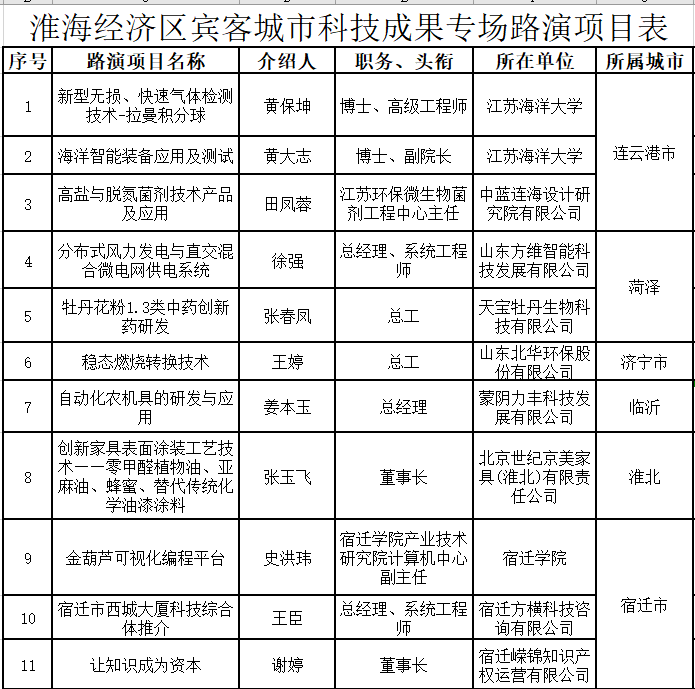 附:淮海經(jīng)濟區賓客城市科技成果路演項目表